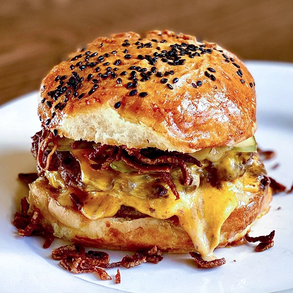 raspberry cheesecake slice table with burger & chips, napkin & man holding beer